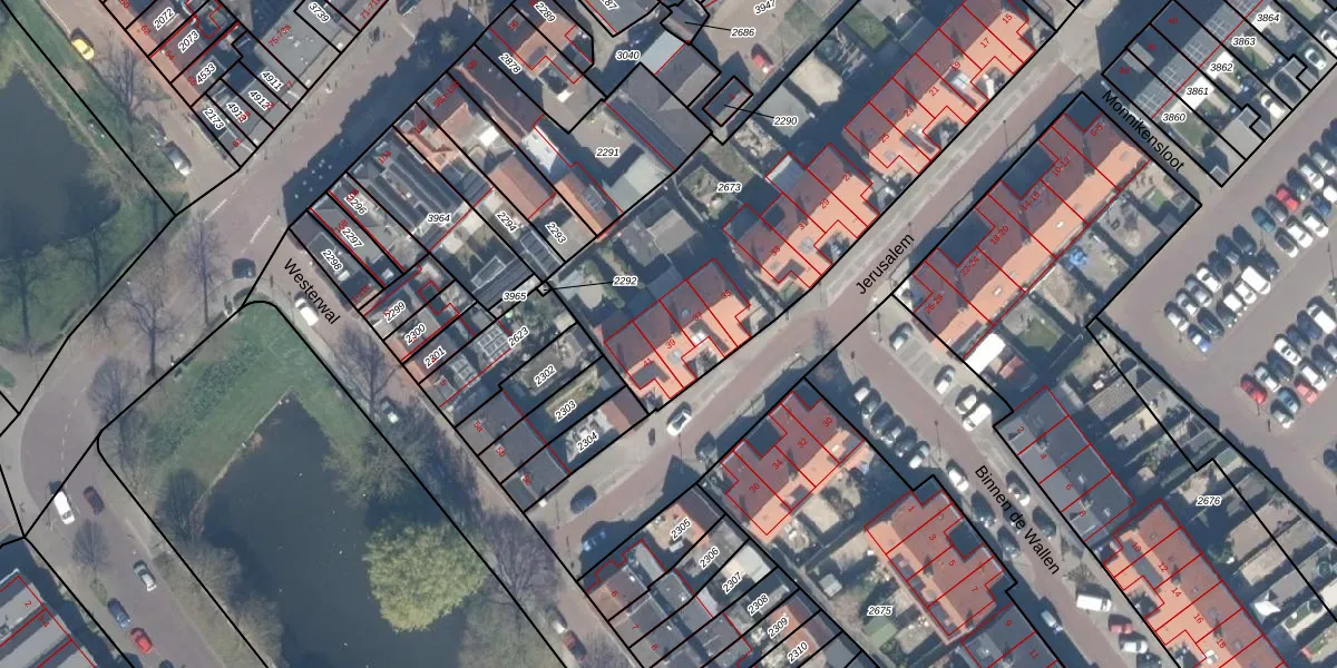 Het perceel waarop Jerusalem 39 staat heeft een oppervlakte van 2092 m². Dit is een zeer groot perceel. De perceeloppervlakte wordt geregistreerd door het Kadaster. Gedetailleerde informatie over de maten van dit perceel kunt u vinden in het rapport Kadastrale kaart met maatvoering van Jerusalem 39.