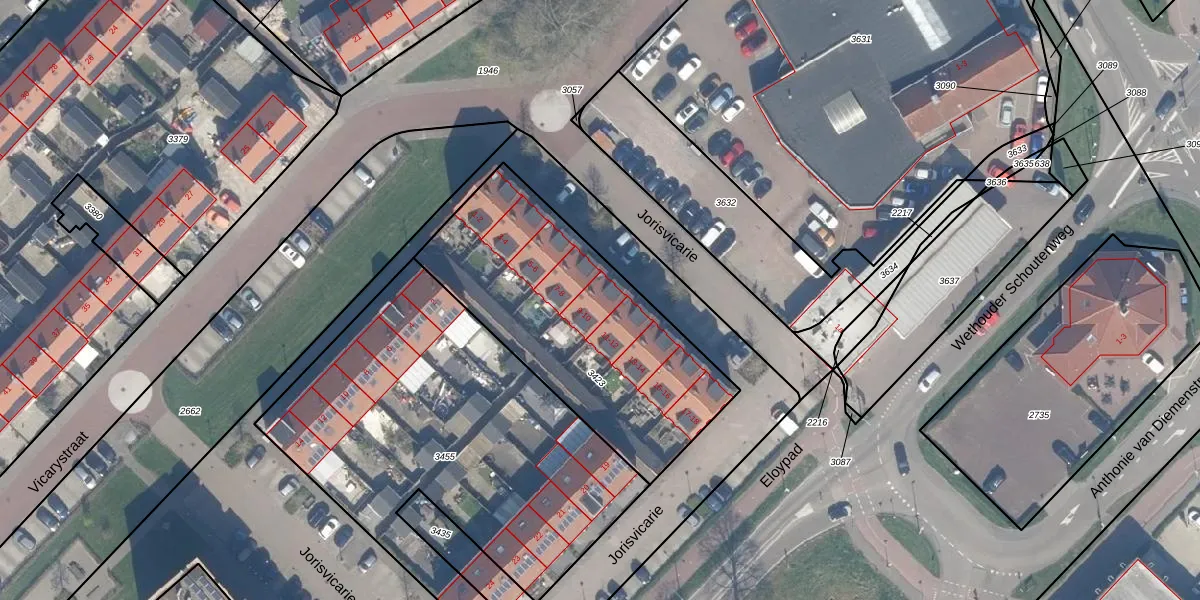 Het perceel waarop Jorisvicarie 10 staat heeft een oppervlakte van 1196 m². Dit is een zeer groot perceel. De perceeloppervlakte wordt geregistreerd door het Kadaster. Gedetailleerde informatie over de maten van dit perceel kunt u vinden in het rapport Kadastrale kaart met maatvoering van Jorisvicarie 10.