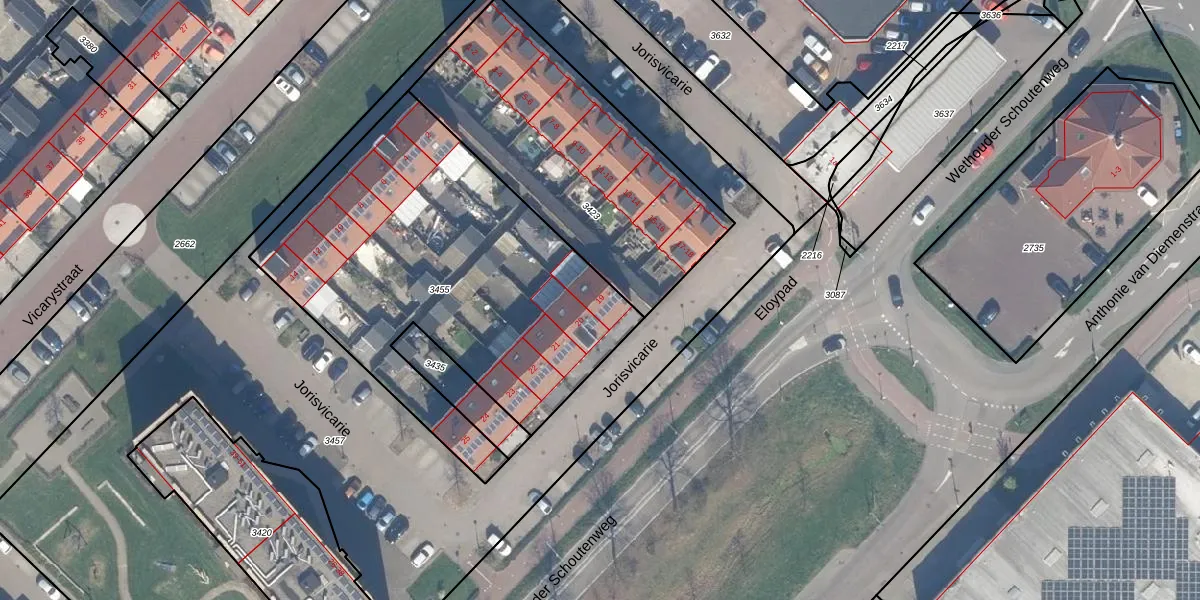Jorisvicarie 19 is gelegen op kadastraal perceel CLB00C3455. Deze kadastrale aanduiding is uniek en wordt gebruikt door het Kadaster om eigendomsrechten en andere zakelijke rechten vast te leggen. Het perceel maakt onderdeel uit van de kadastrale gemeente Culemborg.
