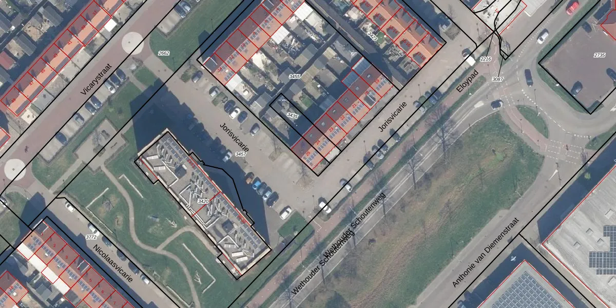 Jorisvicarie 25 is gelegen op kadastraal perceel CLB00C3455. Deze kadastrale aanduiding is uniek en wordt gebruikt door het Kadaster om eigendomsrechten en andere zakelijke rechten vast te leggen. Het perceel maakt onderdeel uit van de kadastrale gemeente Culemborg.