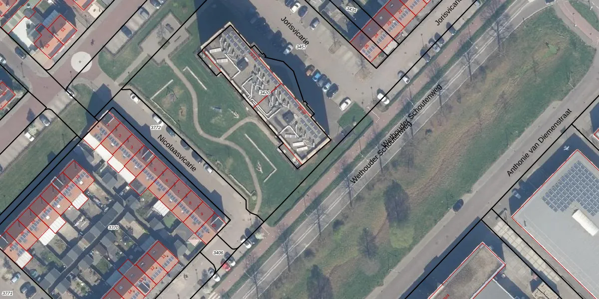 Jorisvicarie 36 is gelegen op kadastraal perceel CLB00C3420. Deze kadastrale aanduiding is uniek en wordt gebruikt door het Kadaster om eigendomsrechten en andere zakelijke rechten vast te leggen. Het perceel maakt onderdeel uit van de kadastrale gemeente Culemborg.