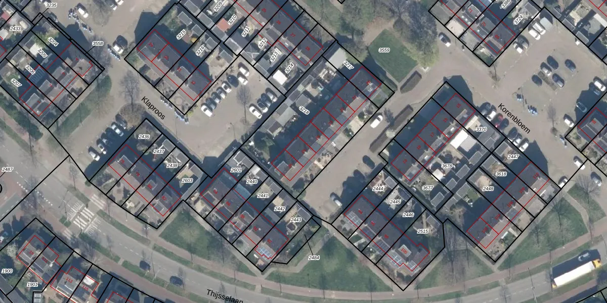 Het perceel waarop Korenbloem 25 staat heeft een oppervlakte van 1039 m². Dit is een zeer groot perceel. De perceeloppervlakte wordt geregistreerd door het Kadaster. Gedetailleerde informatie over de maten van dit perceel kunt u vinden in het rapport Kadastrale kaart met maatvoering van Korenbloem 25.
