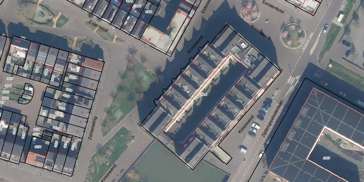 Het perceel waarop Krooneend 34 staat heeft een oppervlakte van 3014 m². Dit is een zeer groot perceel. De perceeloppervlakte wordt geregistreerd door het Kadaster. Gedetailleerde informatie over de maten van dit perceel kunt u vinden in het rapport Kadastrale kaart met maatvoering van Krooneend 34.