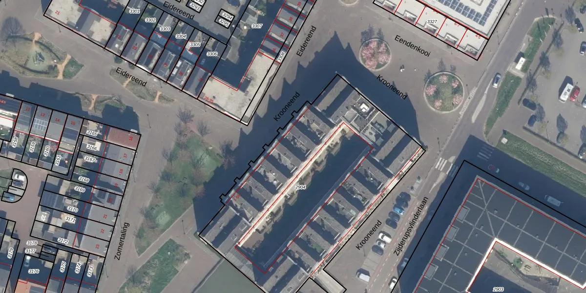 Het perceel waarop Krooneend 36 staat heeft een oppervlakte van 3014 m². Dit is een zeer groot perceel. De perceeloppervlakte wordt geregistreerd door het Kadaster. Gedetailleerde informatie over de maten van dit perceel kunt u vinden in het rapport Kadastrale kaart met maatvoering van Krooneend 36.