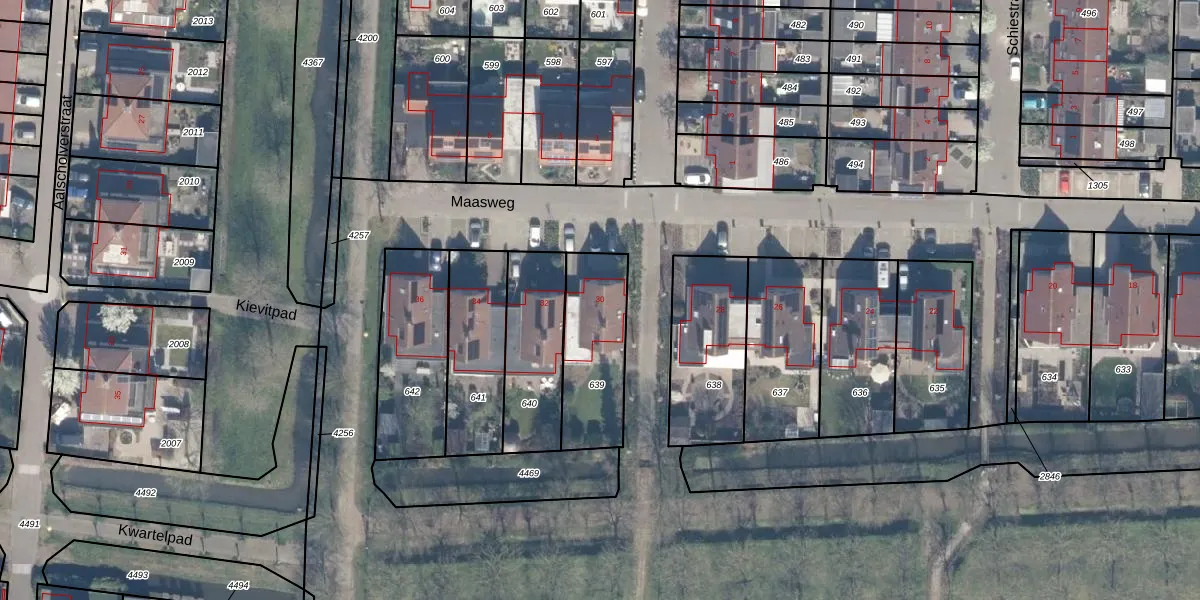Maasweg 30 is gelegen op kadastraal perceel CLB00N639. Deze kadastrale aanduiding is uniek en wordt gebruikt door het Kadaster om eigendomsrechten en andere zakelijke rechten vast te leggen. Het perceel maakt onderdeel uit van de kadastrale gemeente Culemborg.