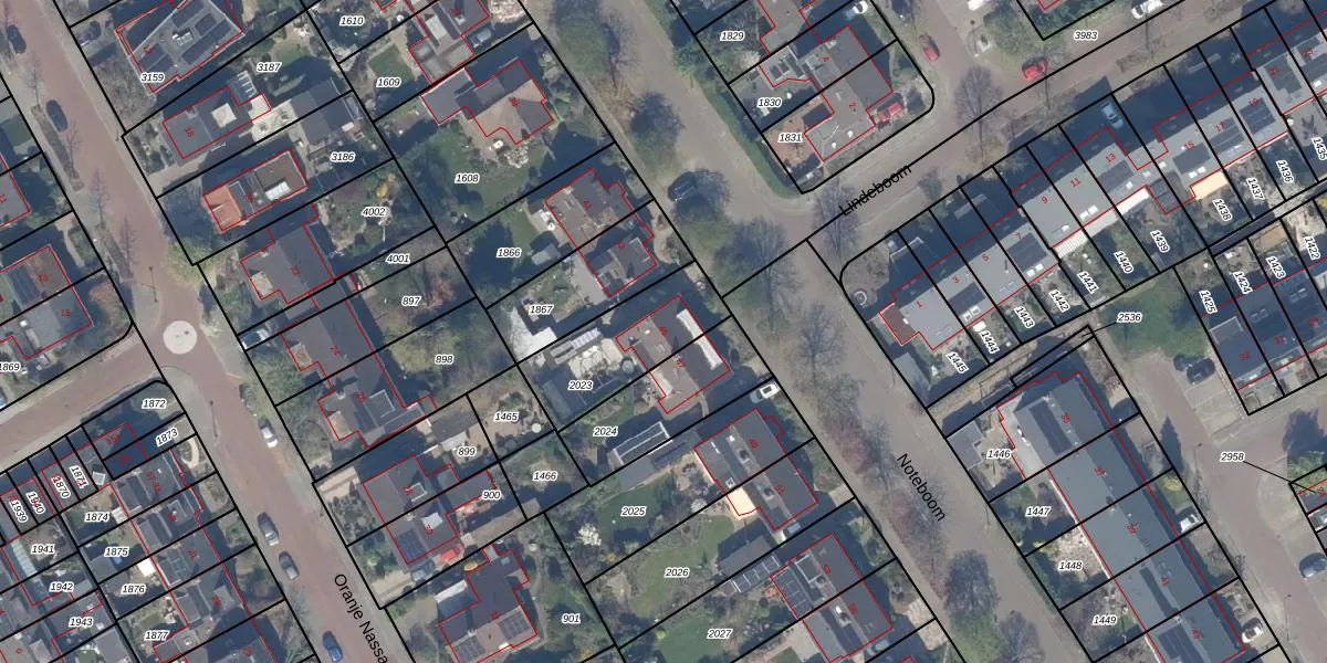 Het perceel waarop Noteboom 45 staat heeft een oppervlakte van 348 m². Dit is een groot perceel. De perceeloppervlakte wordt geregistreerd door het Kadaster. Gedetailleerde informatie over de maten van dit perceel kunt u vinden in het rapport Kadastrale kaart met maatvoering van Noteboom 45.