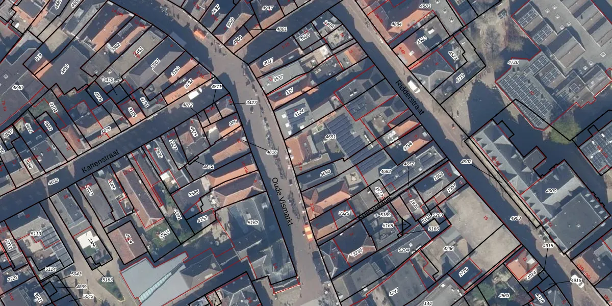 Het perceel waarop Oude Vismarkt 7-e staat heeft een oppervlakte van 580 m². Dit is een groot perceel. De perceeloppervlakte wordt geregistreerd door het Kadaster. Gedetailleerde informatie over de maten van dit perceel kunt u vinden in het rapport Kadastrale kaart met maatvoering van Oude Vismarkt 7-e.