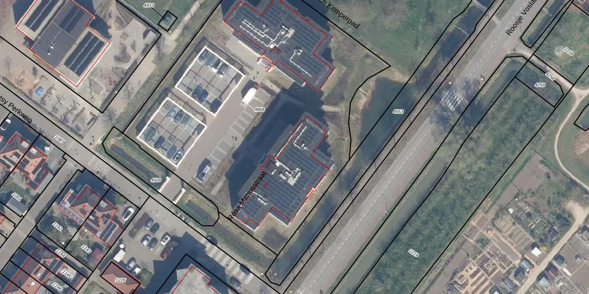 Het perceel waarop Rosa Manusstraat 10 staat heeft een oppervlakte van 4710 m². Dit is een zeer groot perceel. De perceeloppervlakte wordt geregistreerd door het Kadaster. Gedetailleerde informatie over de maten van dit perceel kunt u vinden in het rapport Kadastrale kaart met maatvoering van Rosa Manusstraat 10.