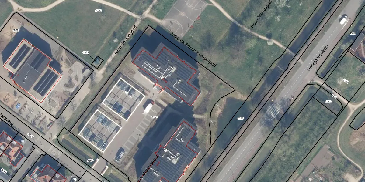 Het perceel waarop Rosa Manusstraat 26 staat heeft een oppervlakte van 4710 m². Dit is een zeer groot perceel. De perceeloppervlakte wordt geregistreerd door het Kadaster. Gedetailleerde informatie over de maten van dit perceel kunt u vinden in het rapport Kadastrale kaart met maatvoering van Rosa Manusstraat 26.