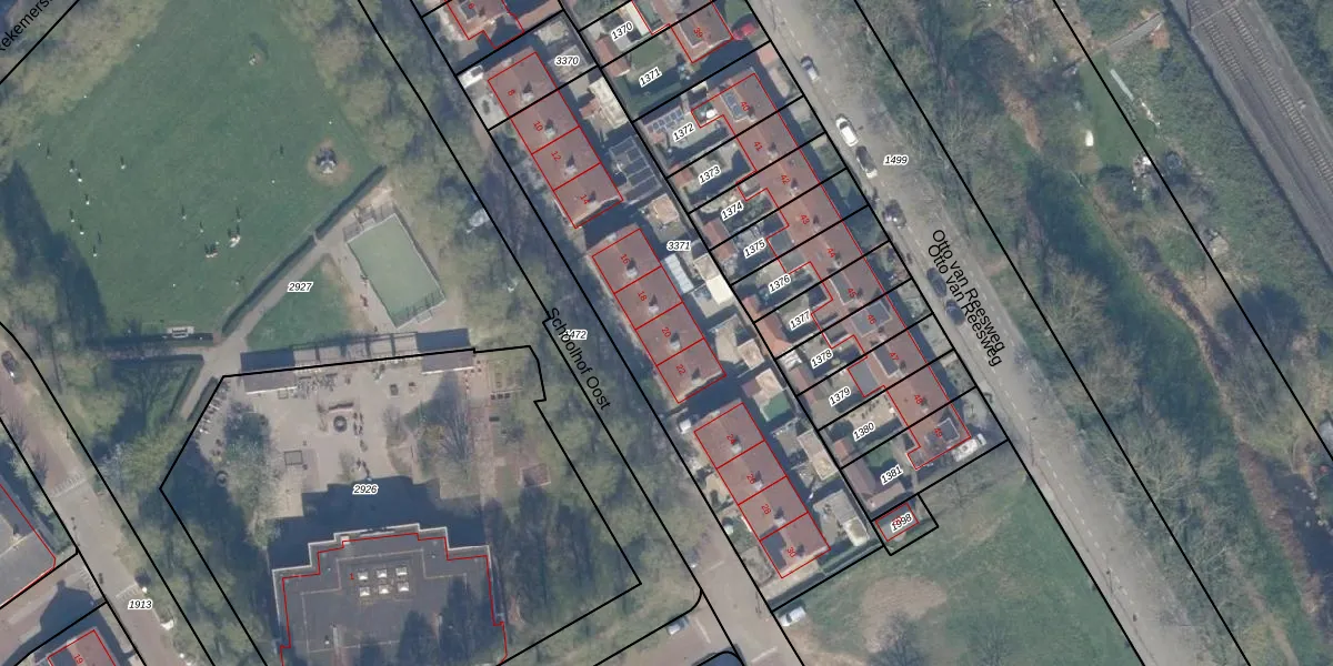 Het perceel waarop Schoolhof Oost 20 staat heeft een oppervlakte van 1615 m². Dit is een zeer groot perceel. De perceeloppervlakte wordt geregistreerd door het Kadaster. Gedetailleerde informatie over de maten van dit perceel kunt u vinden in het rapport Kadastrale kaart met maatvoering van Schoolhof Oost 20.