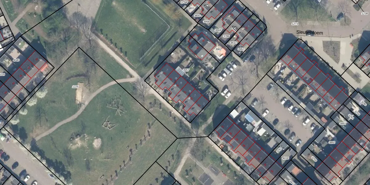 Het perceel waarop Sleutelbloem 44 staat heeft een oppervlakte van 1039 m². Dit is een zeer groot perceel. De perceeloppervlakte wordt geregistreerd door het Kadaster. Gedetailleerde informatie over de maten van dit perceel kunt u vinden in het rapport Kadastrale kaart met maatvoering van Sleutelbloem 44.