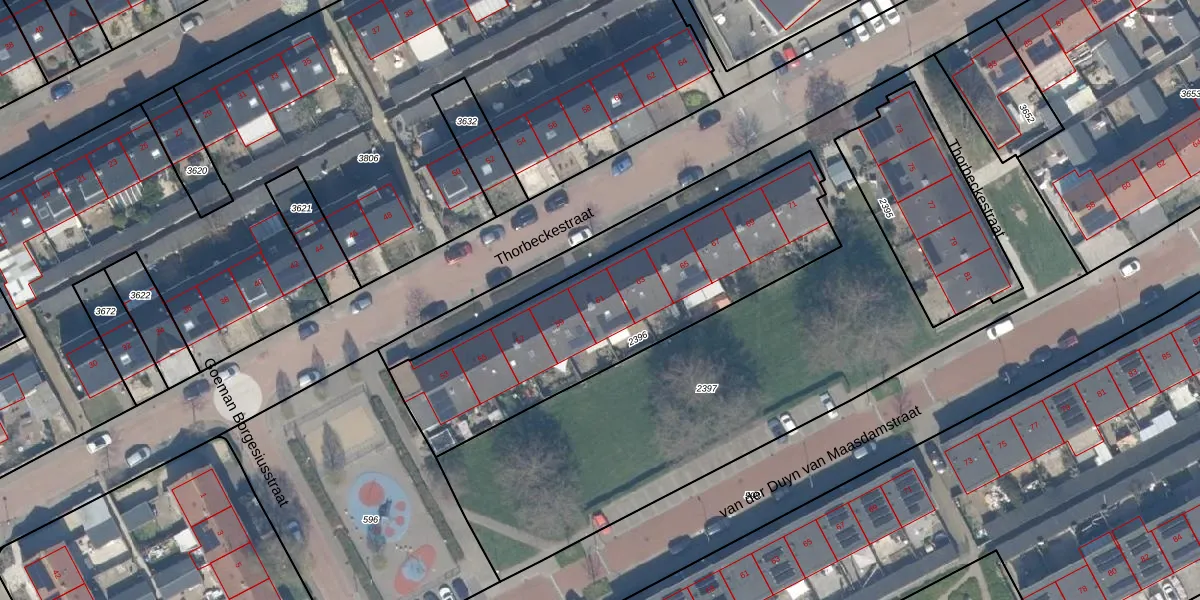 Het perceel waarop Thorbeckestraat 61 staat heeft een oppervlakte van 1365 m². Dit is een zeer groot perceel. De perceeloppervlakte wordt geregistreerd door het Kadaster. Gedetailleerde informatie over de maten van dit perceel kunt u vinden in het rapport Kadastrale kaart met maatvoering van Thorbeckestraat 61.