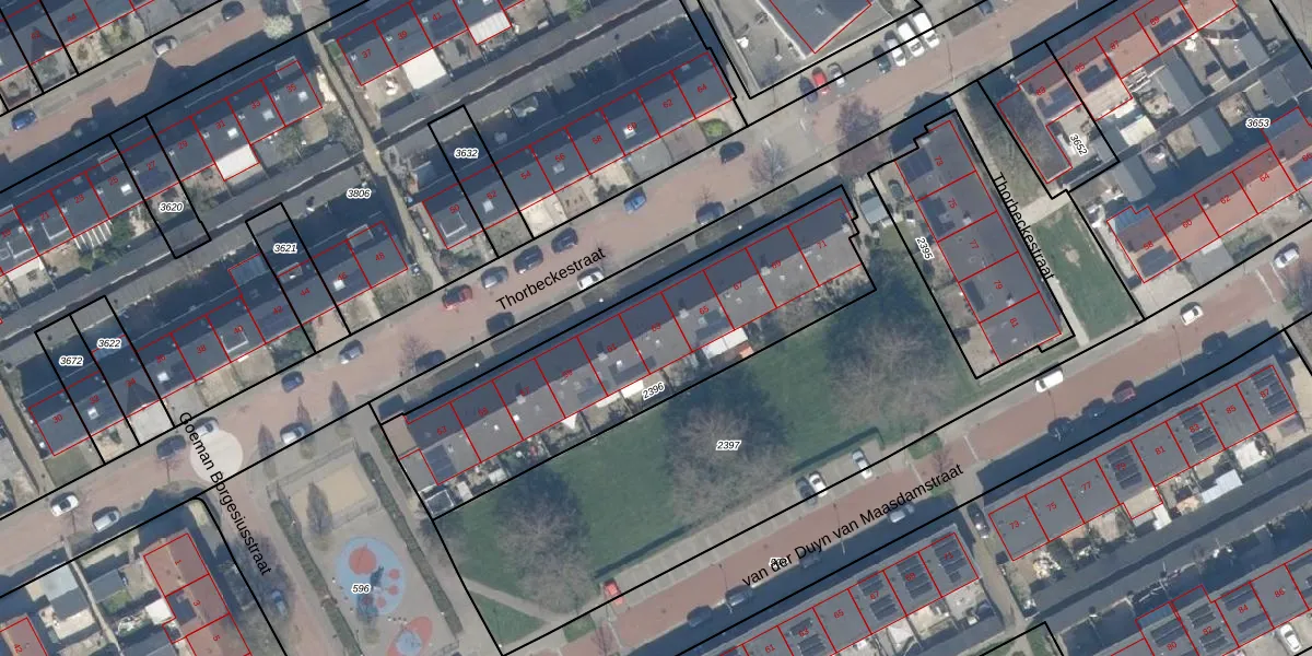 Het perceel waarop Thorbeckestraat 63 staat heeft een oppervlakte van 1365 m². Dit is een zeer groot perceel. De perceeloppervlakte wordt geregistreerd door het Kadaster. Gedetailleerde informatie over de maten van dit perceel kunt u vinden in het rapport Kadastrale kaart met maatvoering van Thorbeckestraat 63.