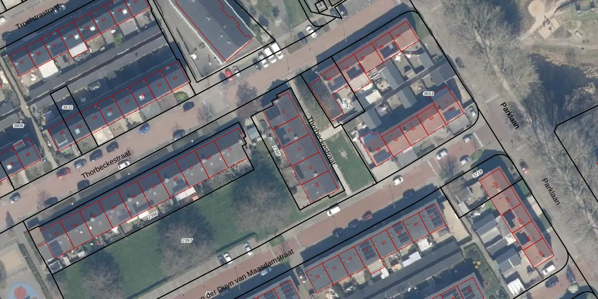 Het perceel waarop Thorbeckestraat 77 staat heeft een oppervlakte van 575 m². Dit is een groot perceel. De perceeloppervlakte wordt geregistreerd door het Kadaster. Gedetailleerde informatie over de maten van dit perceel kunt u vinden in het rapport Kadastrale kaart met maatvoering van Thorbeckestraat 77.
