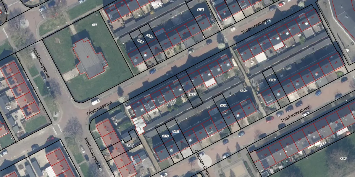 Het perceel waarop Troelstrastraat 25 staat heeft een oppervlakte van 5480 m². Dit is een zeer groot perceel. De perceeloppervlakte wordt geregistreerd door het Kadaster. Gedetailleerde informatie over de maten van dit perceel kunt u vinden in het rapport Kadastrale kaart met maatvoering van Troelstrastraat 25.