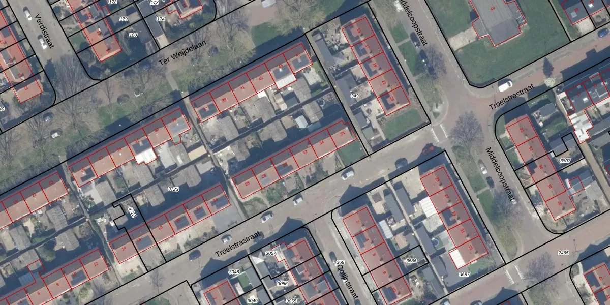 Het perceel waarop Troelstrastraat 32 staat heeft een oppervlakte van 5980 m². Dit is een zeer groot perceel. De perceeloppervlakte wordt geregistreerd door het Kadaster. Gedetailleerde informatie over de maten van dit perceel kunt u vinden in het rapport Kadastrale kaart met maatvoering van Troelstrastraat 32.