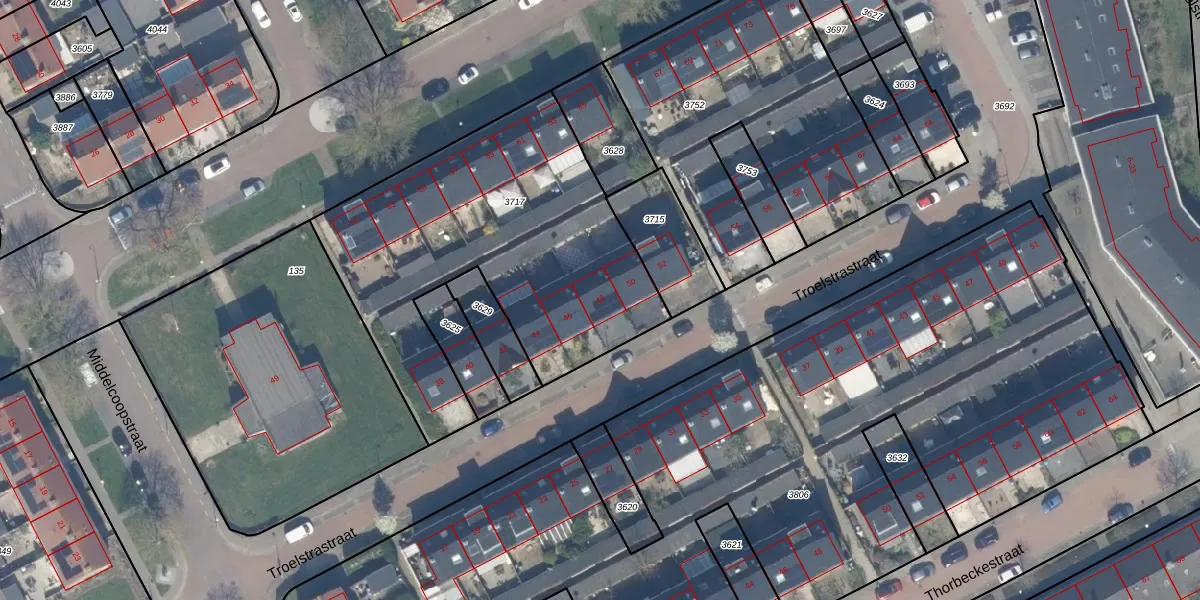 Het perceel waarop Troelstrastraat 48 staat heeft een oppervlakte van 1678 m². Dit is een zeer groot perceel. De perceeloppervlakte wordt geregistreerd door het Kadaster. Gedetailleerde informatie over de maten van dit perceel kunt u vinden in het rapport Kadastrale kaart met maatvoering van Troelstrastraat 48.