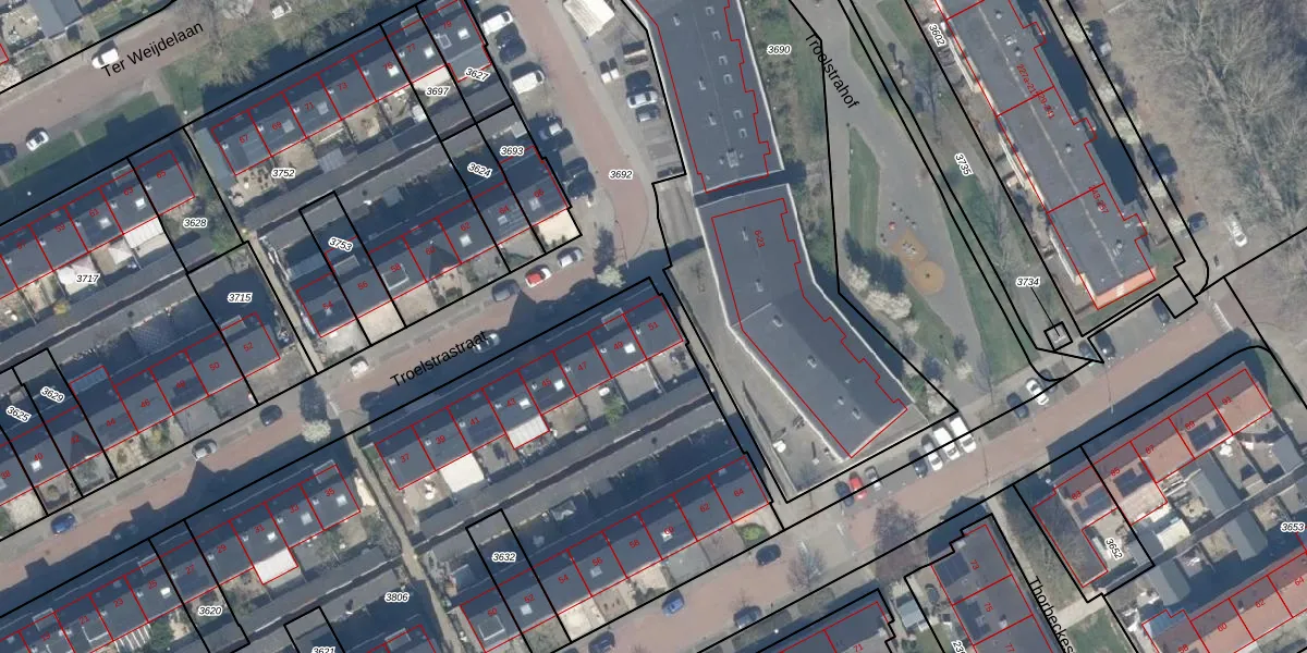 Het perceel waarop Troelstrastraat 51 staat heeft een oppervlakte van 5480 m². Dit is een zeer groot perceel. De perceeloppervlakte wordt geregistreerd door het Kadaster. Gedetailleerde informatie over de maten van dit perceel kunt u vinden in het rapport Kadastrale kaart met maatvoering van Troelstrastraat 51.