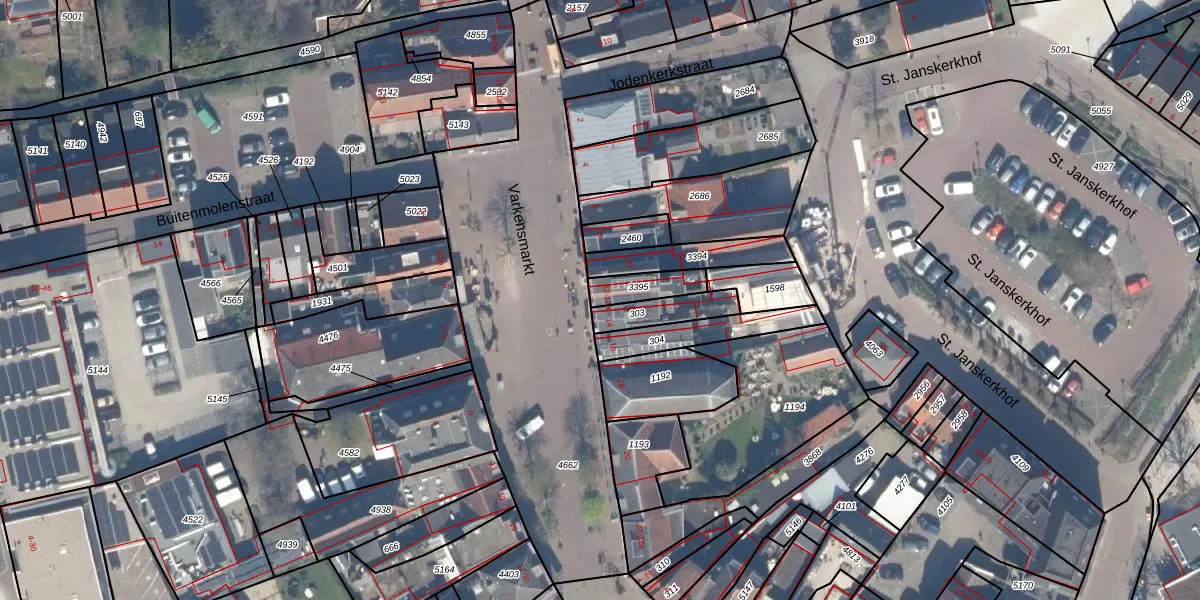 Het perceel waarop Varkensmarkt 12 staat heeft een oppervlakte van 84 m². Dit is een klein perceel. De perceeloppervlakte wordt geregistreerd door het Kadaster. Gedetailleerde informatie over de maten van dit perceel kunt u vinden in het rapport Kadastrale kaart met maatvoering van Varkensmarkt 12.