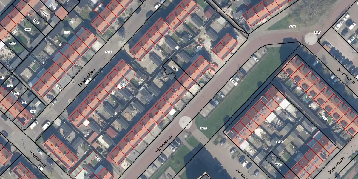 Het perceel waarop Vicarystraat 33 staat heeft een oppervlakte van 5755 m². Dit is een zeer groot perceel. De perceeloppervlakte wordt geregistreerd door het Kadaster. Gedetailleerde informatie over de maten van dit perceel kunt u vinden in het rapport Kadastrale kaart met maatvoering van Vicarystraat 33.