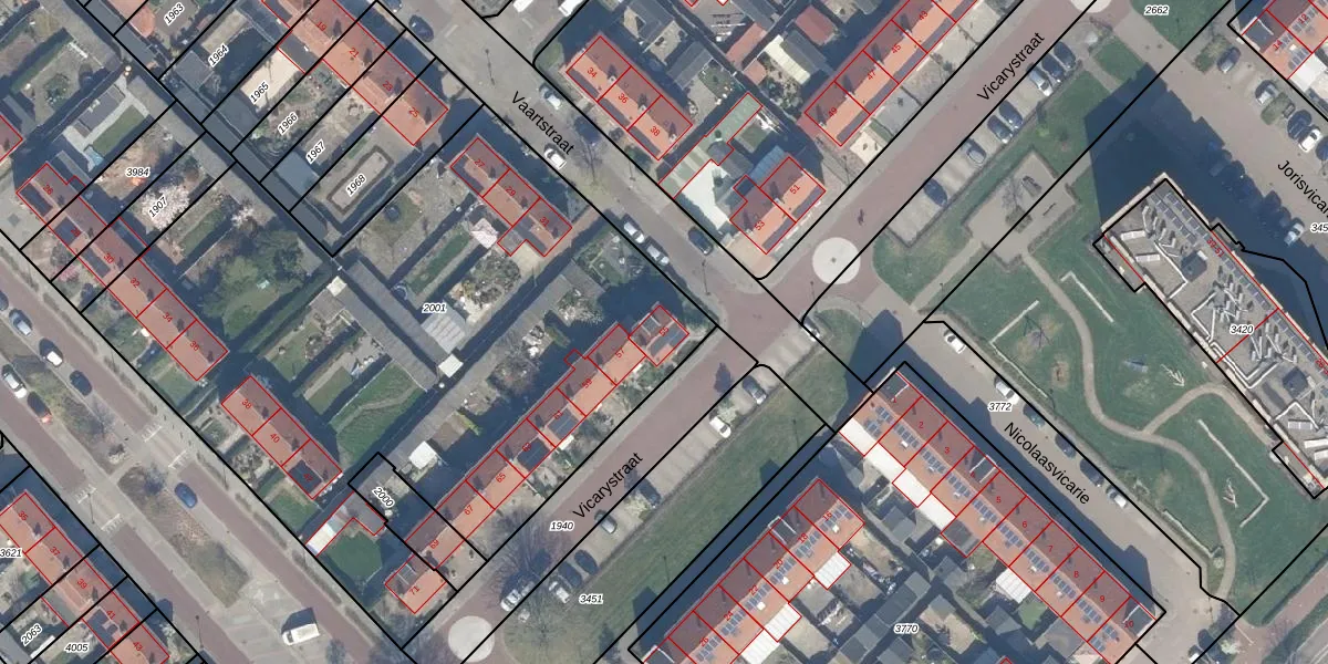 Het perceel waarop Vicarystraat 55 staat heeft een oppervlakte van 3789 m². Dit is een zeer groot perceel. De perceeloppervlakte wordt geregistreerd door het Kadaster. Gedetailleerde informatie over de maten van dit perceel kunt u vinden in het rapport Kadastrale kaart met maatvoering van Vicarystraat 55.