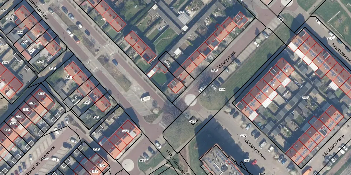 Het perceel waarop Vicarystraat 71 staat heeft een oppervlakte van 3789 m². Dit is een zeer groot perceel. De perceeloppervlakte wordt geregistreerd door het Kadaster. Gedetailleerde informatie over de maten van dit perceel kunt u vinden in het rapport Kadastrale kaart met maatvoering van Vicarystraat 71.