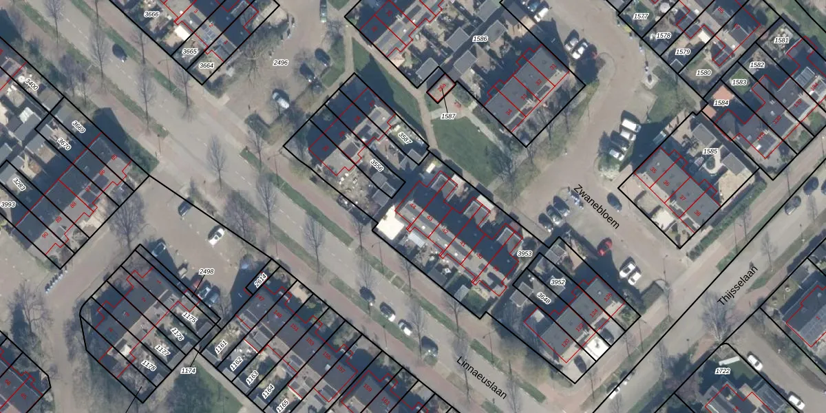 Het perceel waarop Zwanebloem 44 staat heeft een oppervlakte van 1569 m². Dit is een zeer groot perceel. De perceeloppervlakte wordt geregistreerd door het Kadaster. Gedetailleerde informatie over de maten van dit perceel kunt u vinden in het rapport Kadastrale kaart met maatvoering van Zwanebloem 44.
