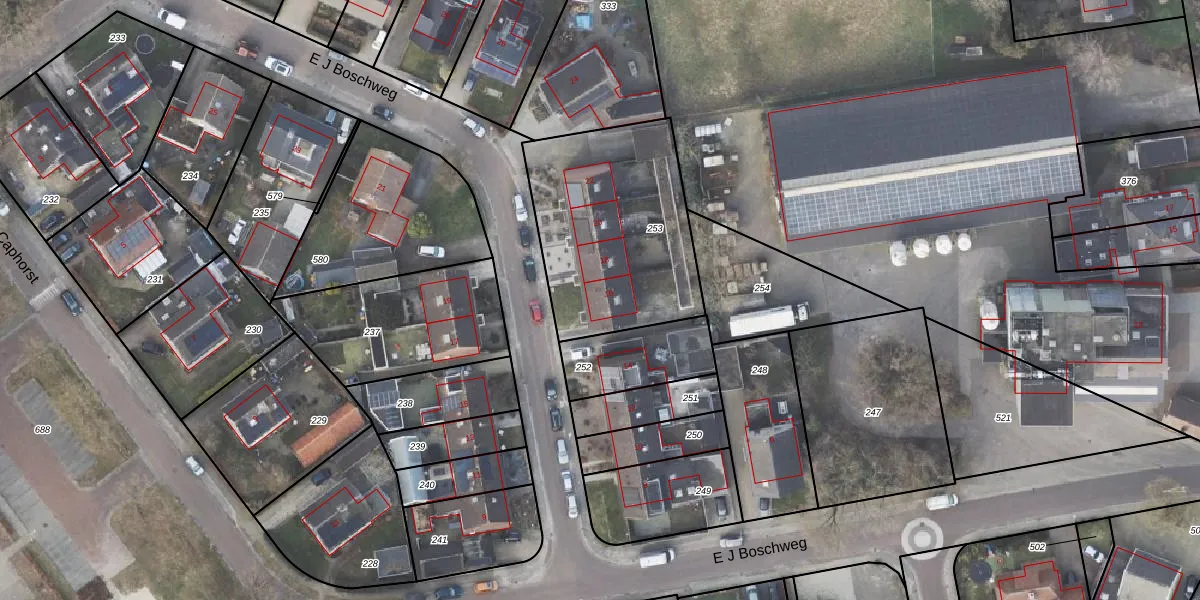 E J Boschweg 16 is gelegen op kadastraal perceel HLD01Y253. Deze kadastrale aanduiding is uniek en wordt gebruikt door het Kadaster om eigendomsrechten en andere zakelijke rechten vast te leggen. Het perceel maakt onderdeel uit van de kadastrale gemeente Hellendoorn.