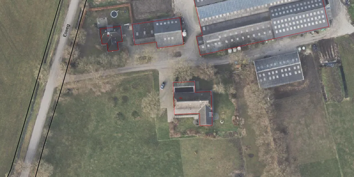 Het perceel waarop Esweg 8-a staat heeft een oppervlakte van 15,4 ha. Dit is een zeer groot perceel. De perceeloppervlakte wordt geregistreerd door het Kadaster. Gedetailleerde informatie over de maten van dit perceel kunt u vinden in het rapport Kadastrale kaart met maatvoering van Esweg 8-a.