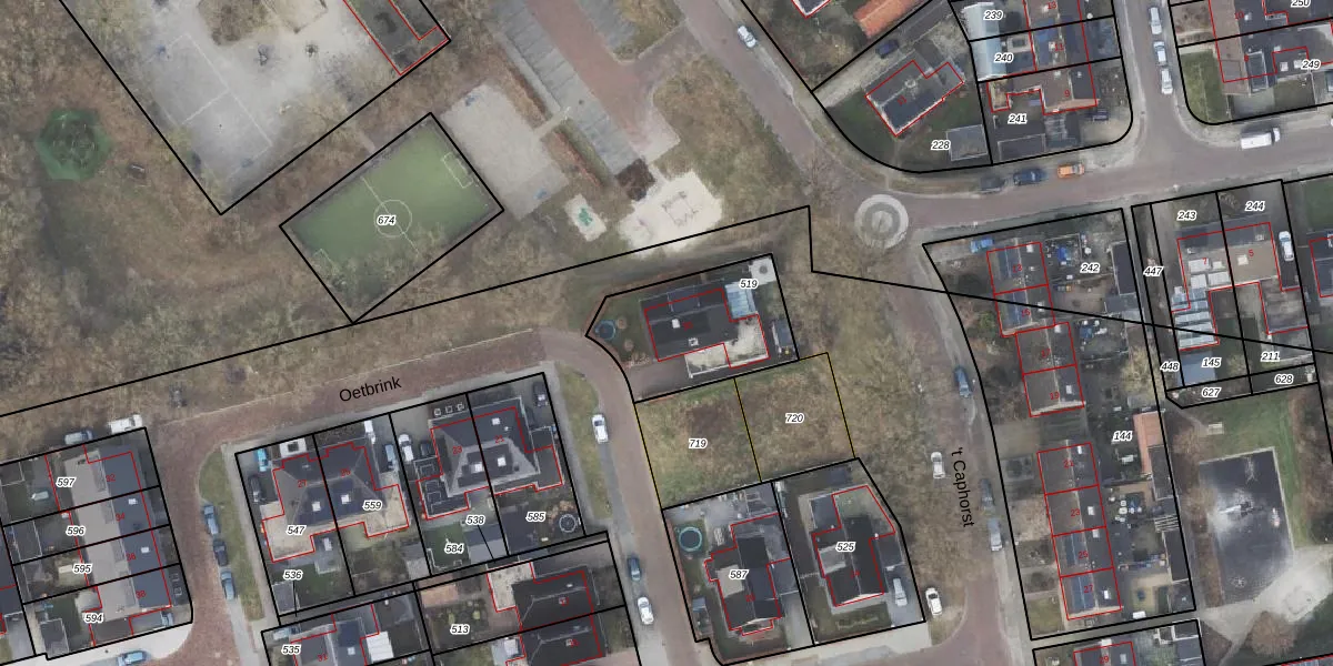 Het perceel waarop Oetbrink 30 staat heeft een oppervlakte van 447 m². Dit is een groot perceel. De perceeloppervlakte wordt geregistreerd door het Kadaster. Gedetailleerde informatie over de maten van dit perceel kunt u vinden in het rapport Kadastrale kaart met maatvoering van Oetbrink 30.