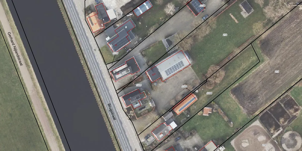 Het perceel waarop Brugstraat 61-a staat heeft een oppervlakte van 4710 m². Dit is een zeer groot perceel. De perceeloppervlakte wordt geregistreerd door het Kadaster. Gedetailleerde informatie over de maten van dit perceel kunt u vinden in het rapport Kadastrale kaart met maatvoering van Brugstraat 61-a.