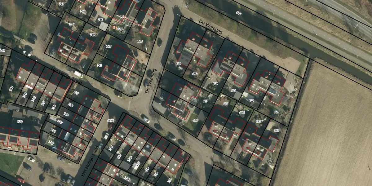 Het perceel waarop De Wetering 21 staat heeft een oppervlakte van 323 m². Dit is een groot perceel. De perceeloppervlakte wordt geregistreerd door het Kadaster. Gedetailleerde informatie over de maten van dit perceel kunt u vinden in het rapport Kadastrale kaart met maatvoering van De Wetering 21.