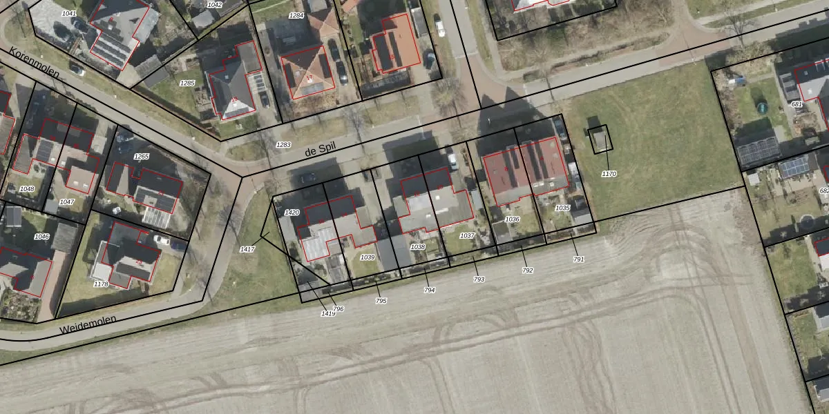 Het perceel waarop de Spil 12 staat heeft een oppervlakte van 304 m². Dit is een groot perceel. De perceeloppervlakte wordt geregistreerd door het Kadaster. Gedetailleerde informatie over de maten van dit perceel kunt u vinden in het rapport Kadastrale kaart met maatvoering van de Spil 12.