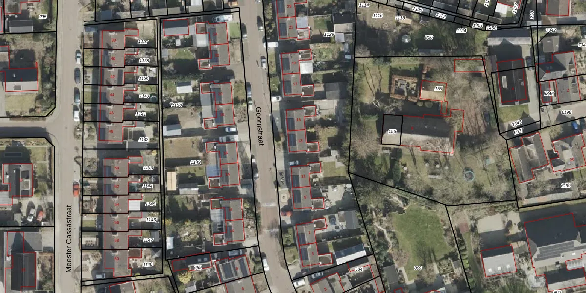 Het perceel waarop Goornstraat 13 staat heeft een oppervlakte van 2729 m². Dit is een zeer groot perceel. De perceeloppervlakte wordt geregistreerd door het Kadaster. Gedetailleerde informatie over de maten van dit perceel kunt u vinden in het rapport Kadastrale kaart met maatvoering van Goornstraat 13.