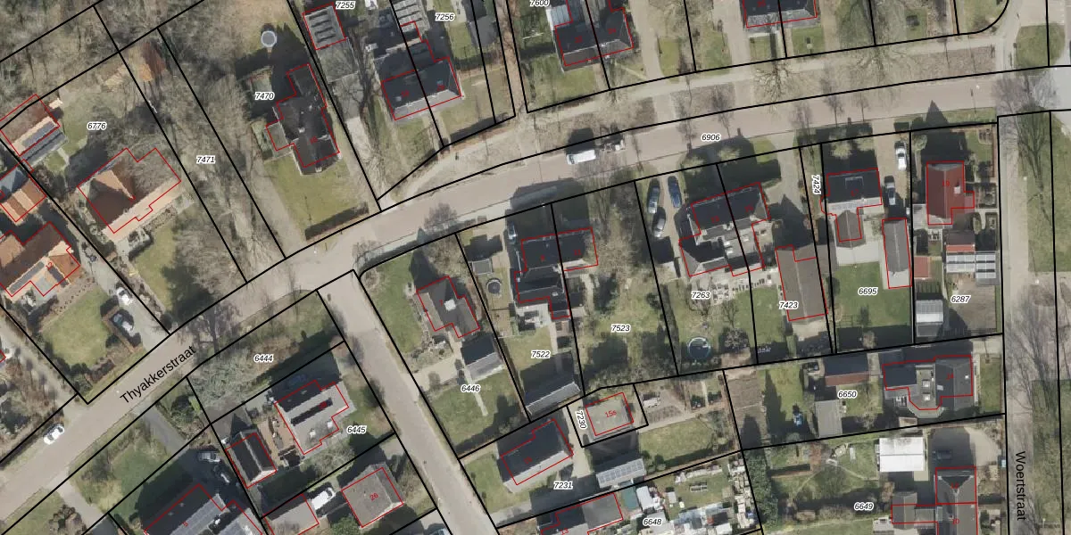 Het perceel waarop Thyakkerstraat 9 staat heeft een oppervlakte van 565 m². Dit is een groot perceel. De perceeloppervlakte wordt geregistreerd door het Kadaster. Gedetailleerde informatie over de maten van dit perceel kunt u vinden in het rapport Kadastrale kaart met maatvoering van Thyakkerstraat 9.