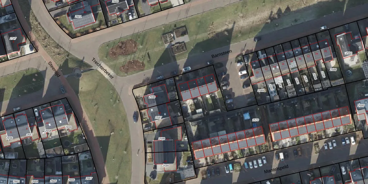 Het perceel waarop Barnsteen 2 staat heeft een oppervlakte van 2939 m². Dit is een zeer groot perceel. De perceeloppervlakte wordt geregistreerd door het Kadaster. Gedetailleerde informatie over de maten van dit perceel kunt u vinden in het rapport Kadastrale kaart met maatvoering van Barnsteen 2.