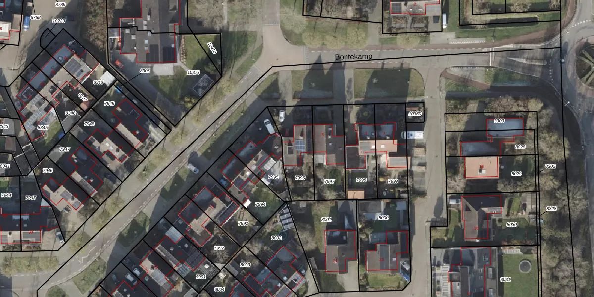 Het perceel waarop Bontekamp 7 staat heeft een oppervlakte van 342 m². Dit is een groot perceel. De perceeloppervlakte wordt geregistreerd door het Kadaster. Gedetailleerde informatie over de maten van dit perceel kunt u vinden in het rapport Kadastrale kaart met maatvoering van Bontekamp 7.