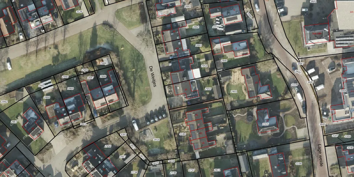 Het perceel waarop De Weitjes 30 staat heeft een oppervlakte van 433 m². Dit is een groot perceel. De perceeloppervlakte wordt geregistreerd door het Kadaster. Gedetailleerde informatie over de maten van dit perceel kunt u vinden in het rapport Kadastrale kaart met maatvoering van De Weitjes 30.