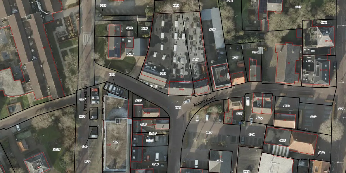 Het perceel waarop Emmastraat 9-A staat heeft een oppervlakte van 1087 m². Dit is een zeer groot perceel. De perceeloppervlakte wordt geregistreerd door het Kadaster. Gedetailleerde informatie over de maten van dit perceel kunt u vinden in het rapport Kadastrale kaart met maatvoering van Emmastraat 9-A.