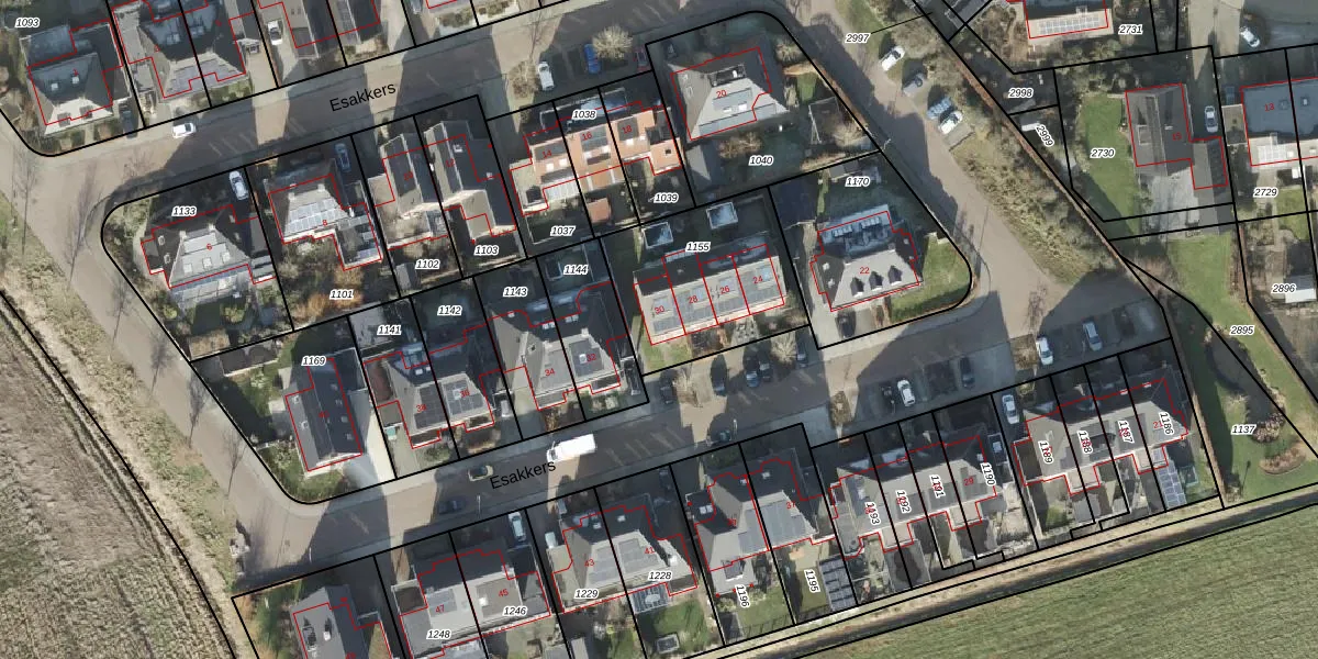 Het perceel waarop Esakkers 30 staat heeft een oppervlakte van 590 m². Dit is een groot perceel. De perceeloppervlakte wordt geregistreerd door het Kadaster. Gedetailleerde informatie over de maten van dit perceel kunt u vinden in het rapport Kadastrale kaart met maatvoering van Esakkers 30.