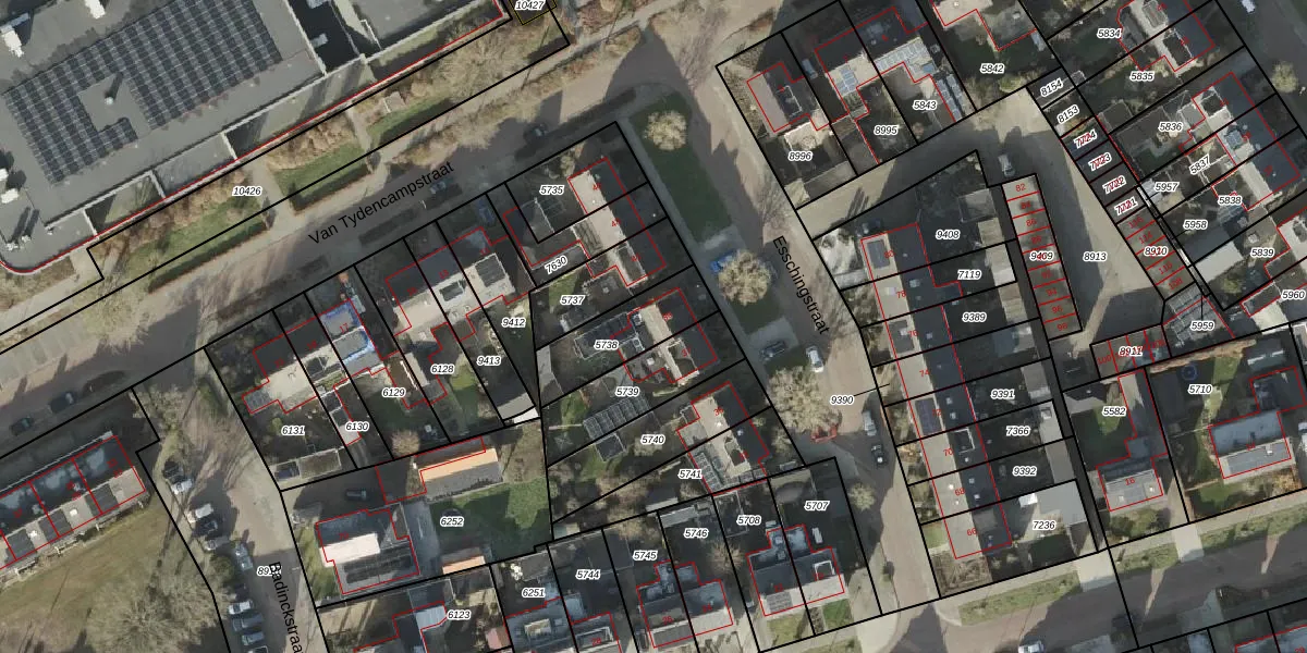 Het perceel waarop Esschingstraat 39 staat heeft een oppervlakte van 244 m². Dit is een middelgroot perceel. De perceeloppervlakte wordt geregistreerd door het Kadaster. Gedetailleerde informatie over de maten van dit perceel kunt u vinden in het rapport Kadastrale kaart met maatvoering van Esschingstraat 39.