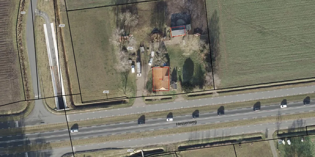Hessenweg 101 is gelegen op kadastraal perceel DSN01R1892. Deze kadastrale aanduiding is uniek en wordt gebruikt door het Kadaster om eigendomsrechten en andere zakelijke rechten vast te leggen. Het perceel maakt onderdeel uit van de kadastrale gemeente Dalfsen.