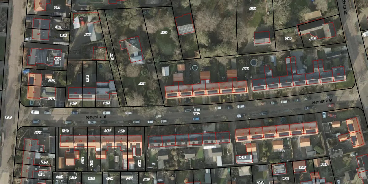 Het perceel waarop Irenestraat 22 staat heeft een oppervlakte van 2615 m². Dit is een zeer groot perceel. De perceeloppervlakte wordt geregistreerd door het Kadaster. Gedetailleerde informatie over de maten van dit perceel kunt u vinden in het rapport Kadastrale kaart met maatvoering van Irenestraat 22.