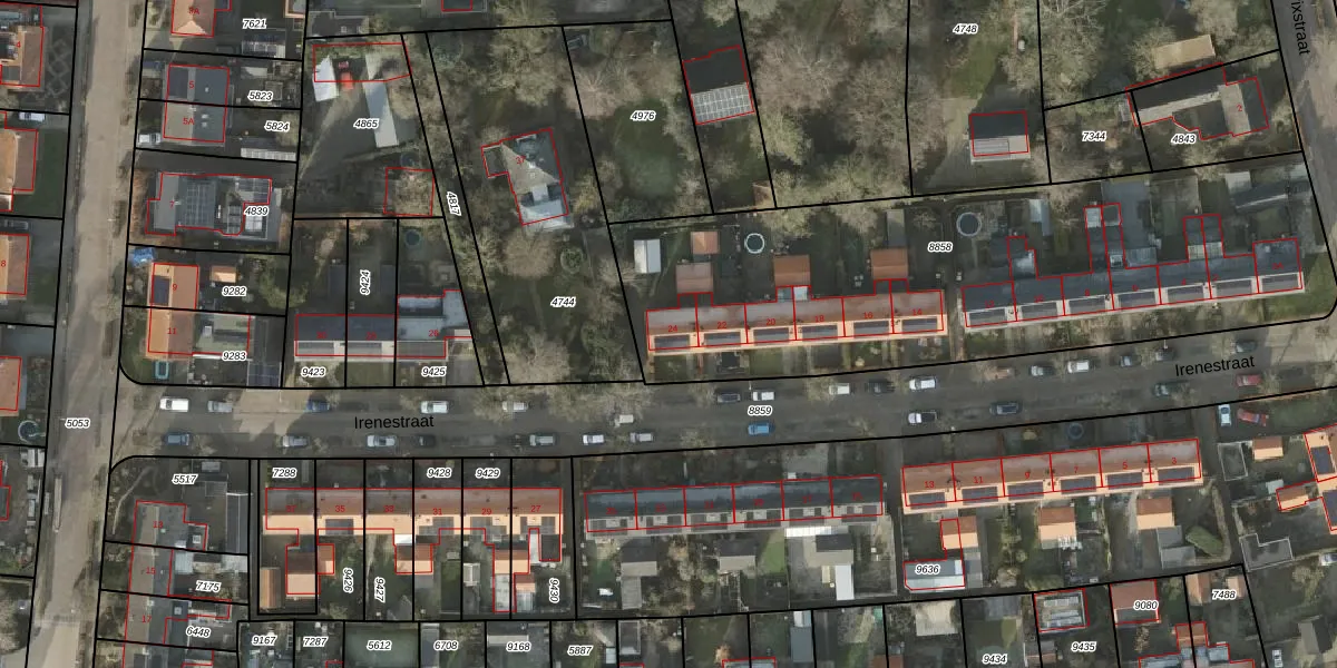 Het perceel waarop Irenestraat 24 staat heeft een oppervlakte van 2615 m². Dit is een zeer groot perceel. De perceeloppervlakte wordt geregistreerd door het Kadaster. Gedetailleerde informatie over de maten van dit perceel kunt u vinden in het rapport Kadastrale kaart met maatvoering van Irenestraat 24.