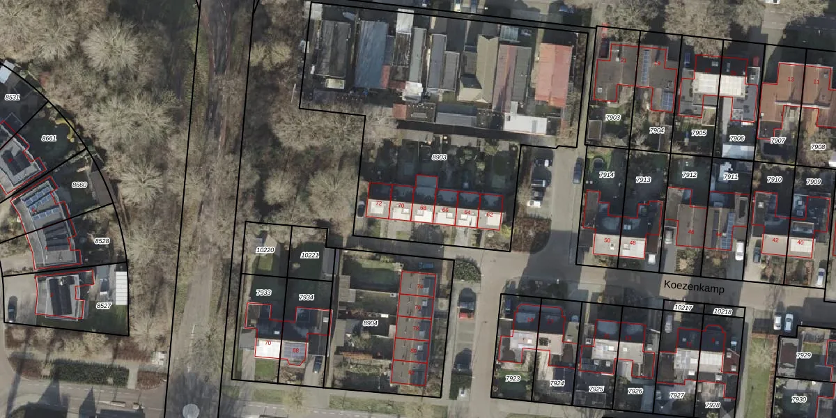Het perceel waarop Koezenkamp 68 staat heeft een oppervlakte van 2822 m². Dit is een zeer groot perceel. De perceeloppervlakte wordt geregistreerd door het Kadaster. Gedetailleerde informatie over de maten van dit perceel kunt u vinden in het rapport Kadastrale kaart met maatvoering van Koezenkamp 68.