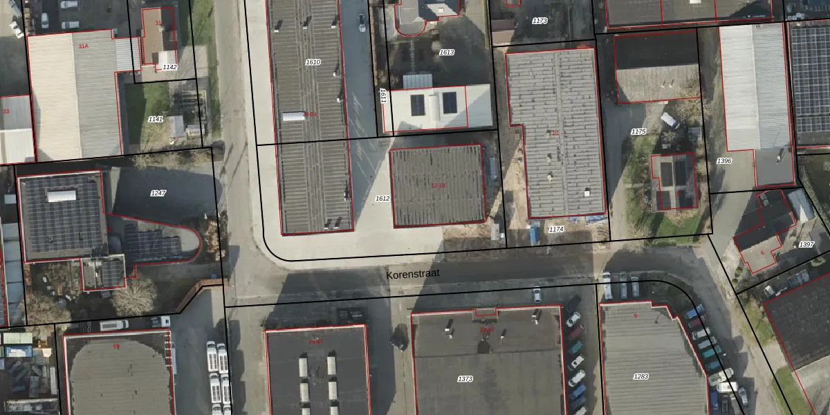 Het perceel waarop Korenstraat 14 staat heeft een oppervlakte van 1645 m². Dit is een zeer groot perceel. De perceeloppervlakte wordt geregistreerd door het Kadaster. Gedetailleerde informatie over de maten van dit perceel kunt u vinden in het rapport Kadastrale kaart met maatvoering van Korenstraat 14.