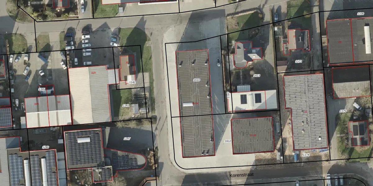 Het perceel waarop Korenstraat 36 staat heeft een oppervlakte van 1180 m². Dit is een zeer groot perceel. De perceeloppervlakte wordt geregistreerd door het Kadaster. Gedetailleerde informatie over de maten van dit perceel kunt u vinden in het rapport Kadastrale kaart met maatvoering van Korenstraat 36.