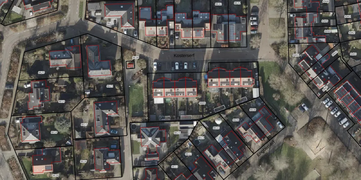 Het perceel waarop Kosterserf 8 staat heeft een oppervlakte van 1590 m². Dit is een zeer groot perceel. De perceeloppervlakte wordt geregistreerd door het Kadaster. Gedetailleerde informatie over de maten van dit perceel kunt u vinden in het rapport Kadastrale kaart met maatvoering van Kosterserf 8.