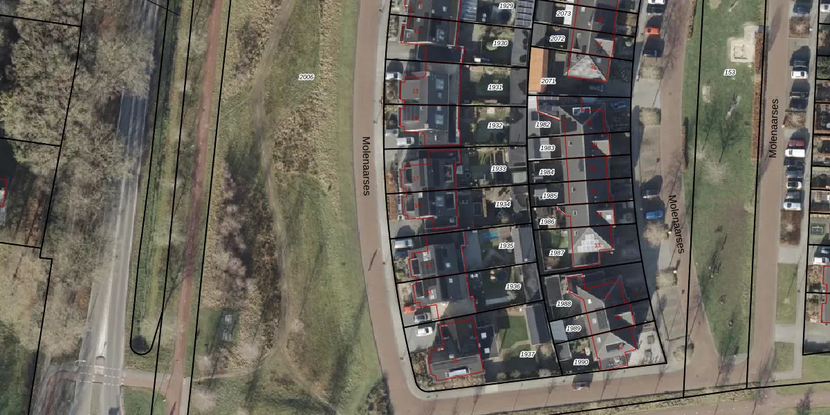 Het perceel waarop Molenaarses 19 staat heeft een oppervlakte van 349 m². Dit is een groot perceel. De perceeloppervlakte wordt geregistreerd door het Kadaster. Gedetailleerde informatie over de maten van dit perceel kunt u vinden in het rapport Kadastrale kaart met maatvoering van Molenaarses 19.