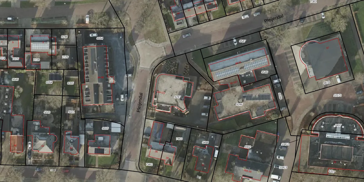 Het perceel waarop Pleijendal 121 staat heeft een oppervlakte van 1110 m². Dit is een zeer groot perceel. De perceeloppervlakte wordt geregistreerd door het Kadaster. Gedetailleerde informatie over de maten van dit perceel kunt u vinden in het rapport Kadastrale kaart met maatvoering van Pleijendal 121.